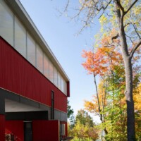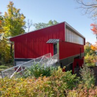 Constructed from off-the-shelf components, like many agrarian structures in the Finger Lakes, the Barn House also learned from the vernacular tradition of other regions. The corner detail of the corrugated metal siding was borrowed from Iceland, where corrugated siding is omnipresent (as local legend has, it came from mainland Europe in the form of ship ballast and was adopted in lieu of wood, which is scarce in Iceland). The siding sheet is simply bent around the corner, eliminating fussy, costly, and often ungraceful detailing.
