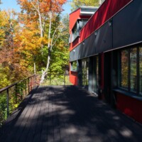 Given the steep ground slope, the site access was an important consideration, as well as the ground disturbance. The house is perched on concrete piers just west of a relatively flat zone, parallel to the lake and the ground slope, that has become the inner courtyard. The “basement” instead is the garage/workshop to the east across the yard, forming a carport and supporting the second level perpendicular to the slope. On the east-most end of the upper level, a prefabricated aluminum gangway connects to the driveway, creating an accessible path to the upper level.