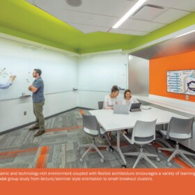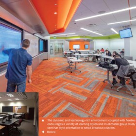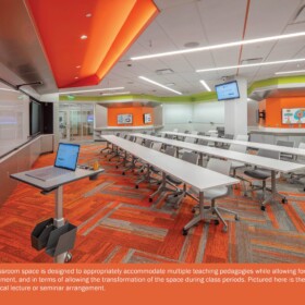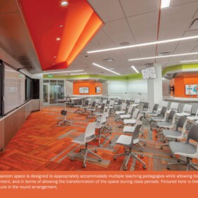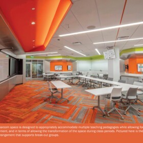 Onondaga Community College’s new 2,200sf innovative classroom creates new and exciting teaching and learning opportunities. The dynamic and technology-rich environment coupled with flexible architecture encourages a variety of teaching and learning styles, as well as multi-modal group study from lecture/seminar style orientation to small breakout clusters.