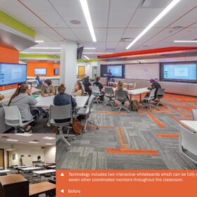 The technology is seamlessly integrated and includes two interactive whiteboards which can be fully matrixed with seven other coordinated monitors in the classroom; AirMedia which allows a laptop to be wirelessly connected to the network of monitors; glass boards that line the perimeter classroom walls for greater collaboration; four pan, tilt, zoom cameras mounted to the ceiling along with multiple microphones which can be used for web conferences; assistive listening; and a document camera in the ceiling.