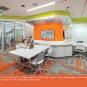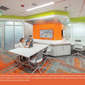 There is also a smaller flexible emerging technologies room which currently utilizes virtual reality equipment to supplement the innovative classroom but can be easily swapped out as an ancillary space to the main classroom with various uses and equipment. Separating the classroom and the emerging technologies room is a switchable smartglass wall that changes from transparent to opaque with the flip of a switch, allowing both the smaller room and the large classroom to be used simultaneously without distracting the other.